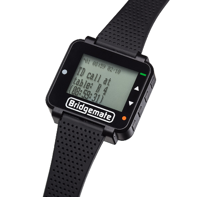 The Bridgemate Pager system works fully on-site, and you don't need an internet connection or any extra software. The Bridgemate Pager has its own USB transmitter, which the user inserts into a USB port on the computer running the Bridgemate Control Software. Every tournament director gets a pager to receive director calls. There are two different Bridgemate Pagers: a watch pager and a pocket pager. The differences are described on this web page. Whenever a table requires a tournament director, there is no longer any need to call out or stand up to attract their attention – everything happens silently, and the director arrives as soon as possible.